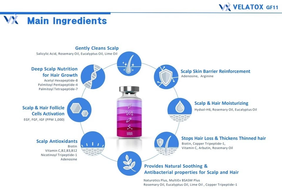 Velash SHGF11 works at the root level to strengthen hair follicles and reduce excessive shedding. It supports tissue repair and enhances scalp microcirculation, ensuring better oxygen and nutrient delivery to the hair roots.